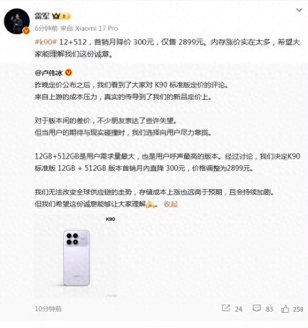 王騰緊跟老板步伐,連夜發文稱“K90價格很厚道”。可用戶不傻——當年小米靠“性價比”屠榜全場,如今卻成了“價格屠夫反被屠”?有老粉心寒吐槽:“以前是為發燒而生,現在是為高價找借口!”