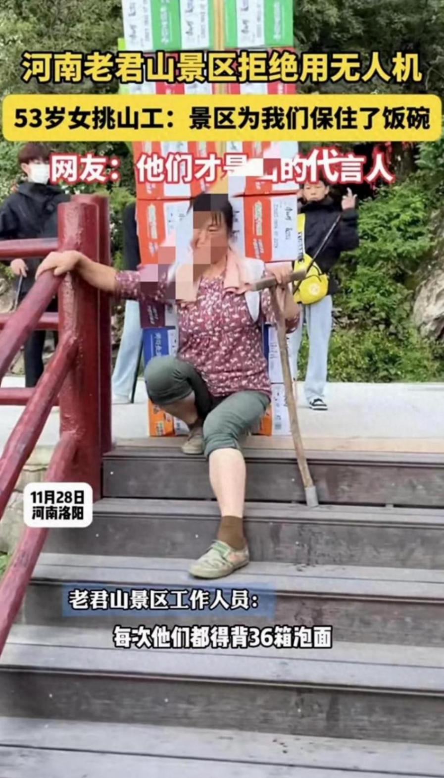 山上的挑山工基本都是中年人,背著幾十箱泡面往上走,腰上纏根繩子防滑。有位大叔干了十五年,背的扁擔都磨得發亮。景區給挑山工安排了免費宿舍,過年還發紅包,說他們是景區的“門面”。但用無人機成本低多了,不少地方都換成機器了,偏偏老君山不換。